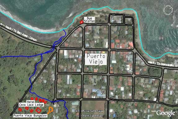 Arrived in Puerto Viejo: In Puerto Viejo we are easy to find like you see on the plan. We are located approx. 300 m from the bus station. Quiet on the outskirts of the village but still central. To the village center with all the shopping facilities, bars and restaurants it is just a short walk. Check in for the Puerto Viejo Bungalow is the reception of the Hotel Coco Loco Lodge. |